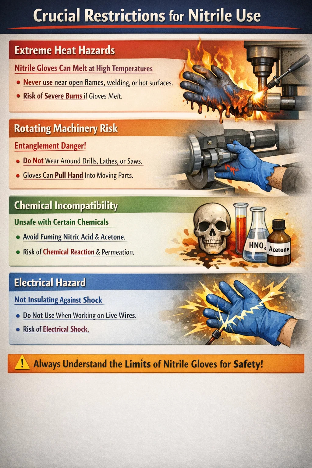 Nejvíce standardní nitrilové pracovní rukavice začnou při teplotách degradovat nebo ztrácet strukturální integritu vyšší než 100 °C (212 °F) . Pokud svařujete, používáte foukačku nebo sáhnete do vysokoteplotní trouby, šplouchnutí horkého kovu nebo přímý plamen vám přitaví rukavici na ruku, což způsobí vážné popáleniny, které jsou pro zdravotníky obtížně léčitelné, protože plast musí být z tkáně chirurgicky odstraněn.