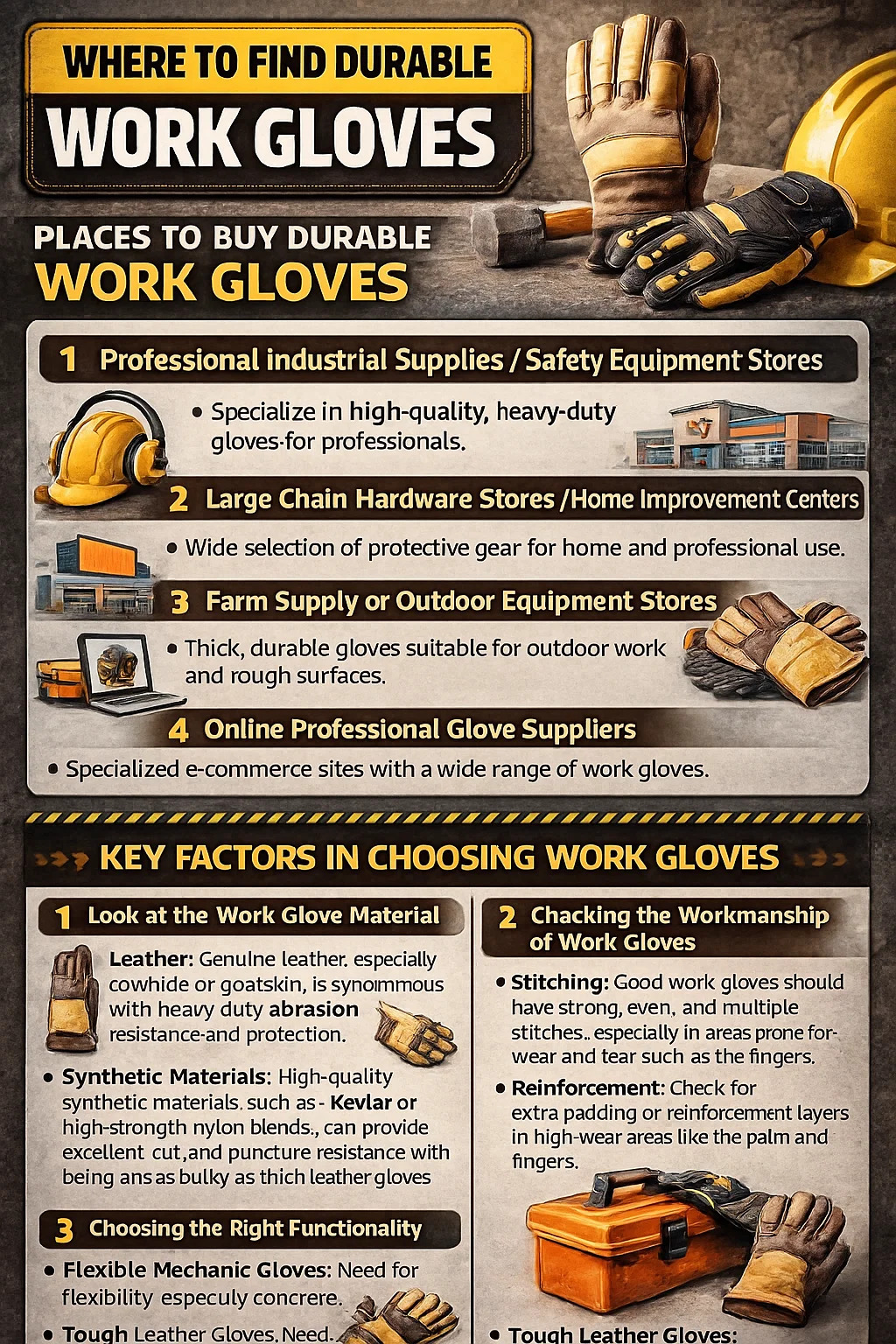 Tyto obchody nejsou tak běžné jako běžné maloobchodní prodejny, ale specializují se na dodávky profesionálů ve stavebnictví, výrobě a dalších průmyslových odvětvích, kteří vyžadují odolné rukavice.